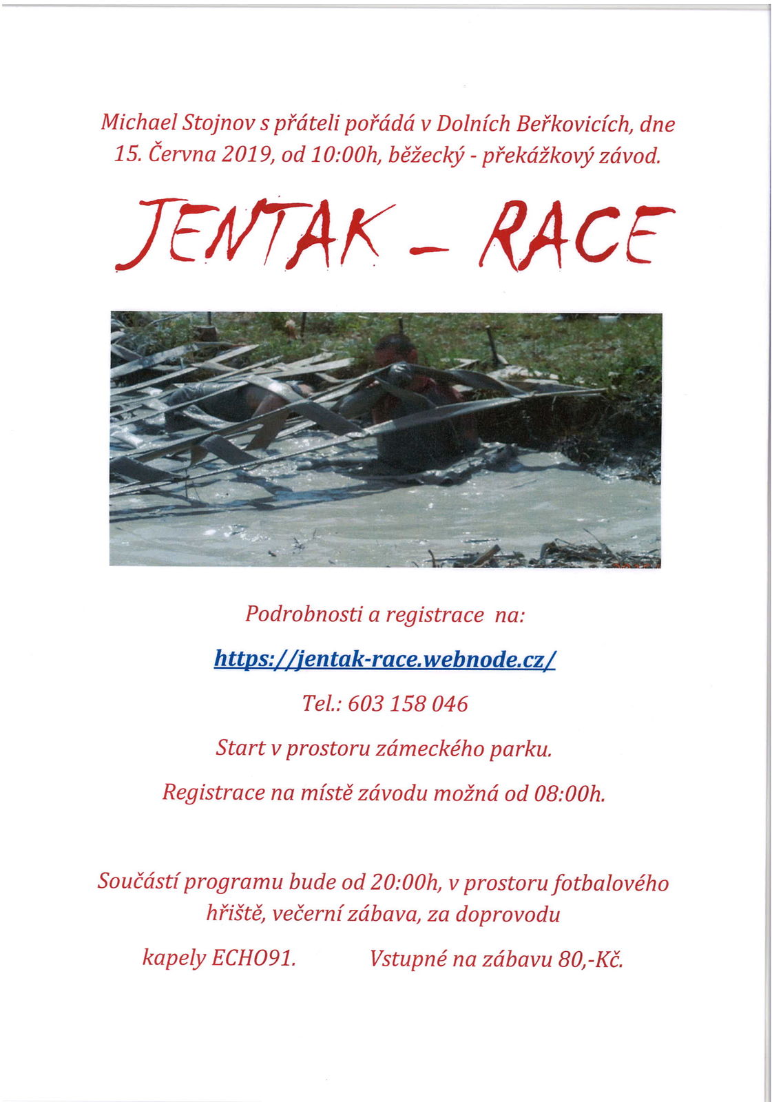 Michael Stojnov s přáteli Vás srdečně zve dne 15.6. 2019 od 10 hodin na běžecký-překážkový závod JENTAK - RACE, který bude spojen s večerní zábavou. Podrobnosti k přihláškám a další informace jsou uvedeny v příloze a na stránkách závodu: https://jentak-race.webnode.cz/