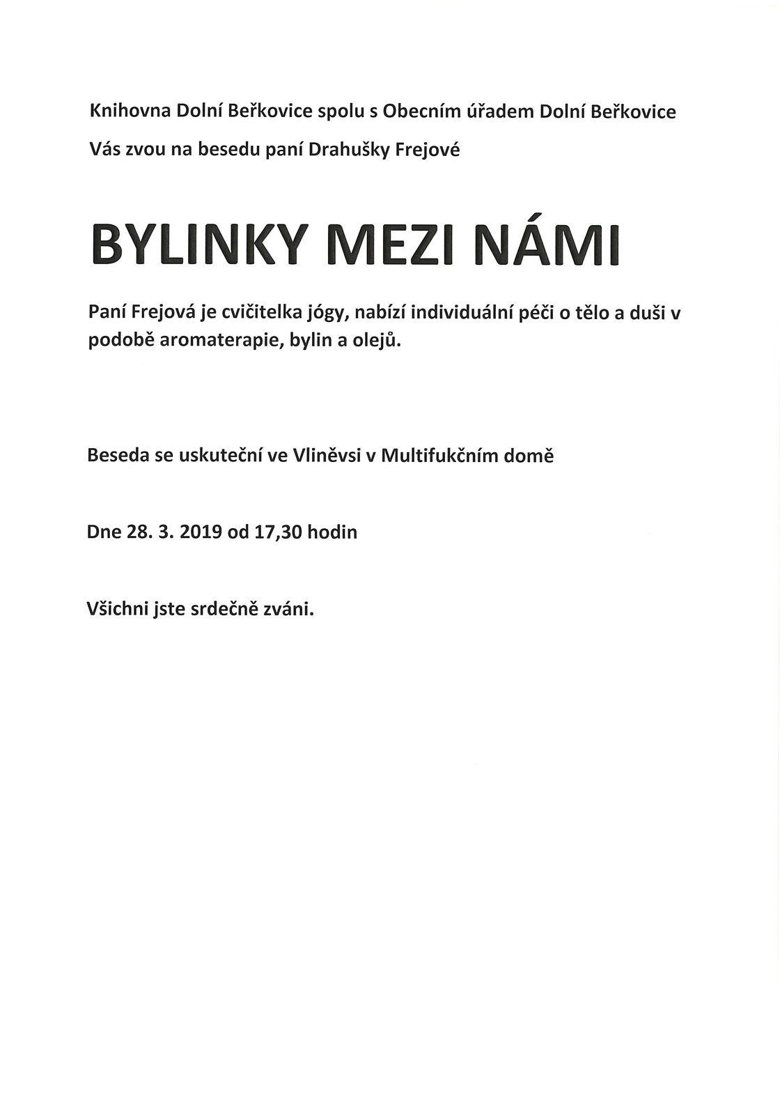 BYLINKY MEZI NÁMI.jpgKnihovna Dolní Beřkovice spolu s OÚ Dolní Beřkovice Vás zvou na besedu Drahušky Frejové dne 28.3. 2019 od 17:30 hodin v Multifunkčním domě Vliněves.Více v příloze.