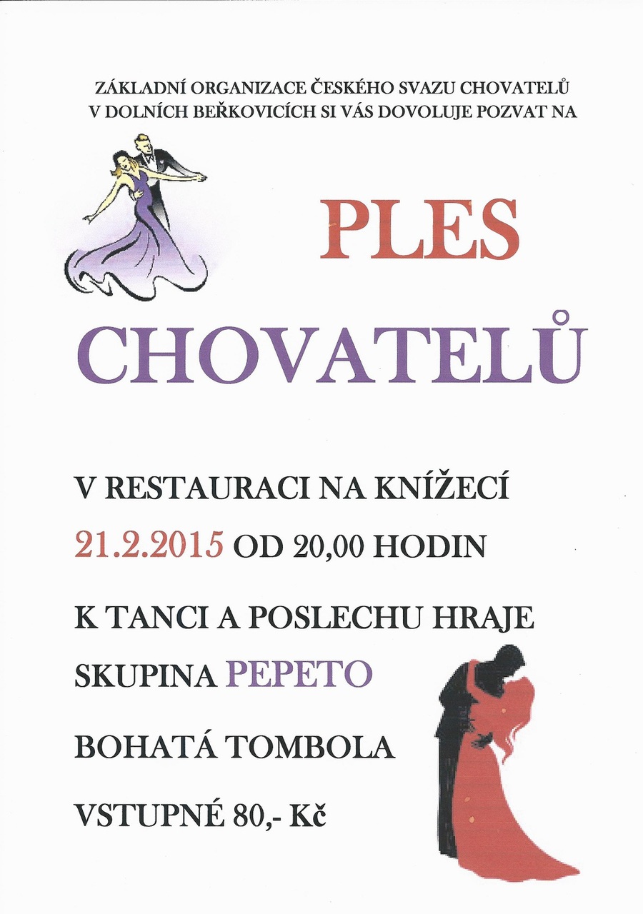 ZO Českého svazu chovatelů si Vás dovoluje pozvat na svůj ples, který se uskuteční v sobotu, 21. února 2015 od 20. 00 hod. na sále restaurace Na Knížecí. K tanci a poslechu bude hrát skupina Pepeto, vstupné je 80 Kč a připravena bohatá tombola.