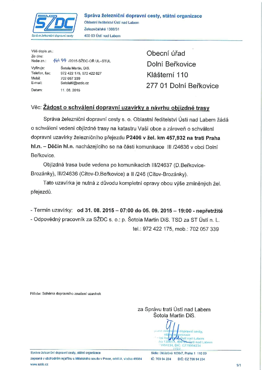 OZNAMUJEME občanům, že z důvodu kompletní opravy železničního přejezdu v Dolních Beřkovicích bude v termínu od 31. srpna 2015 od 7:00 hod. do 5. září 2015 do 19:00 hod. NEPŘETRŽITĚ TENTO PŘEJEZD UZAVŘEN.