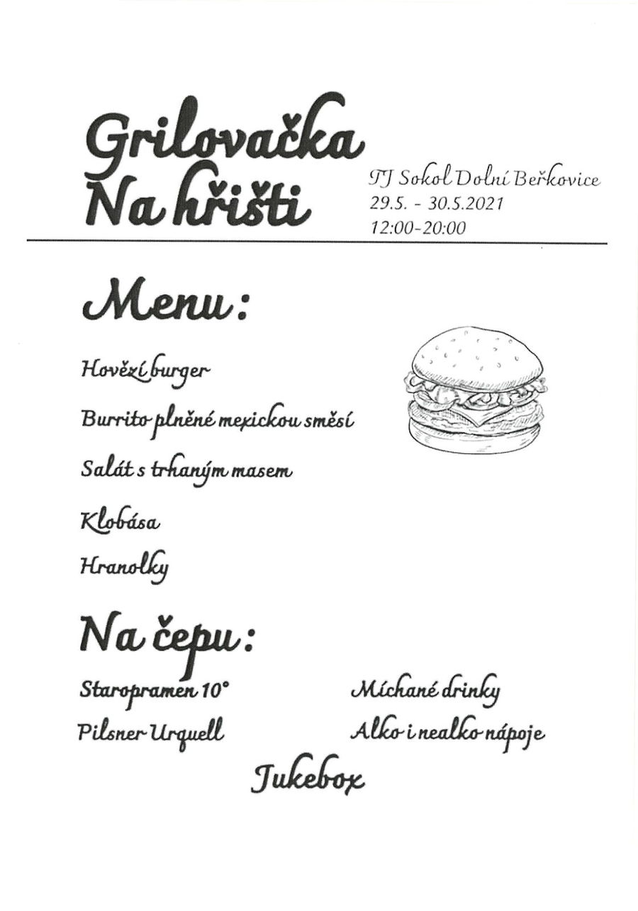 210528102217_0001.jpgHospůdka Na hřišti si dovoluje pozvat všechny milovníky dobrého jídla  o víkendu 29. a 30. 5. 2021 na víkendovou grilovačku.