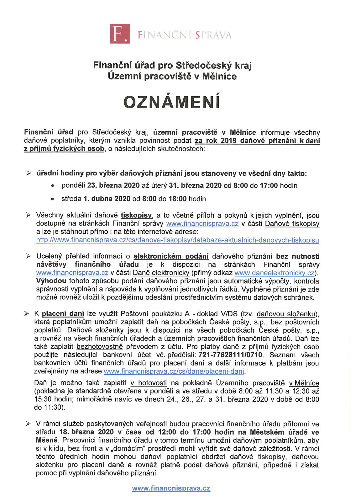 Finanční úřad pro Středočeský kraj - územní pracoviště Mělník informuje o úpravě úředních hodin v souvislosti s podáváním daňových přiznání k dani z příjmů fyzických osob za rok 2019 a o možnosti zasílání přiznání k dani elektronickou cestou.