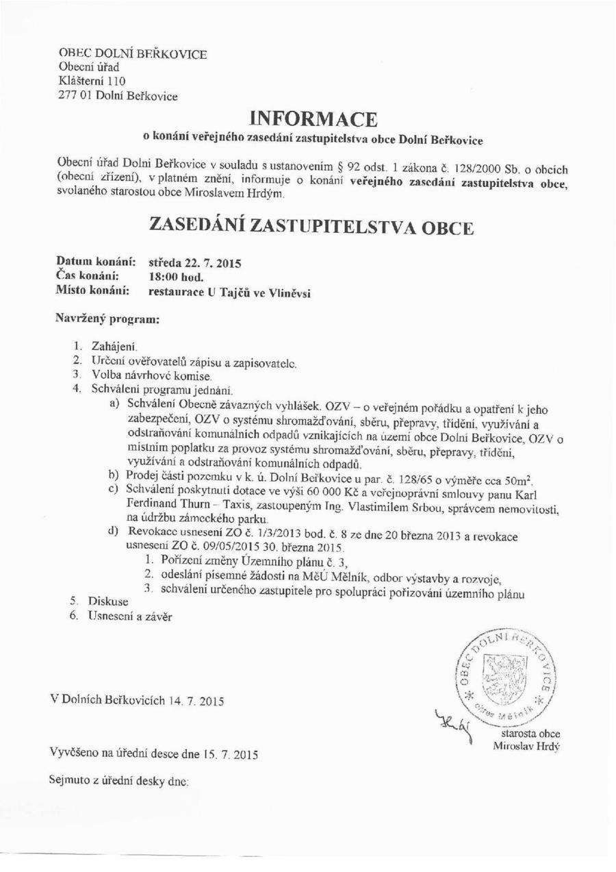 Obec Dolní Beřkovice informuje o konání veřejného zasedání zastupitelstva obce Dolní Beřkovice, které se uskuteční ve středu 22. července 2015 od 18:00 hod. v restauraci U Tajčů ve Vliněvsi.