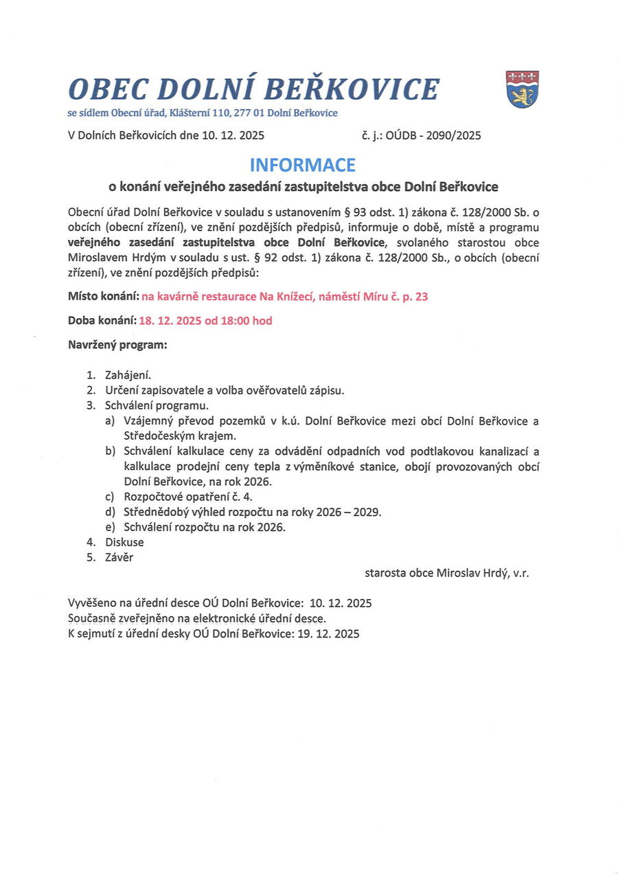 Úvod > Informace > Aktuality > Informace o konání veřejného zasedání zastupitelstva obce dne 18.12.2025.