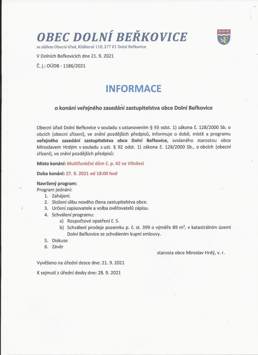 Zastupitelstvo.jpgZveme Vás na veřejné zasedání zastupitelstva obce Dolní Beřkovice, které se bude konat 27.9.2021 od 18 hodin v Multifunkčním domě čp. 42 ve Vliněvsi .