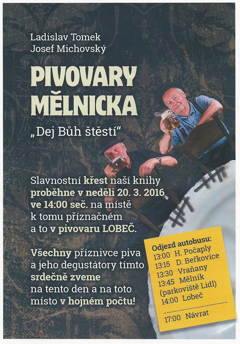 Ladislav Tomek a Josef Michovský si Vás dovolují pozvat na slavnostní křest knihy Pivovary Mělnicka, který proběhne v neděli 20. března 2016 ve 14:00 hod. na místě k tomu příznačném a to v pivovaru Lobeč.