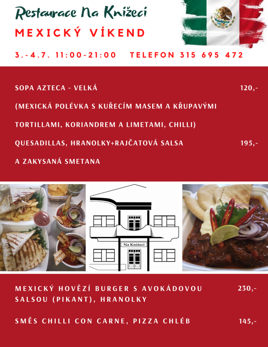 Mexiko červenecFB.pngPřijďte o víkendu od 3. do 4. července do Restaurace Na Knížecí ochutnat ověřené mexické speciality.