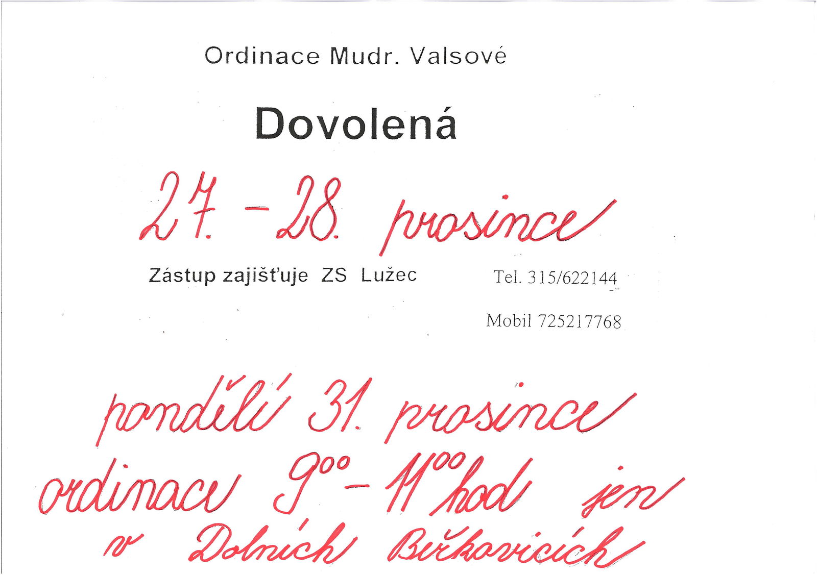 Ordinace MUDr. Valsové oznamuje občanům, že ve dnech 27.12. 2018 a 28. 12. 2018 bude čerpána dovolená. Zástup bude zajištěn zdravotním střediskem Lužec nad Vltavou. V pondělí 31.12. 2018 bude ordinace pouze v Dolních Beřkovicích od 9 do 11 hodin.