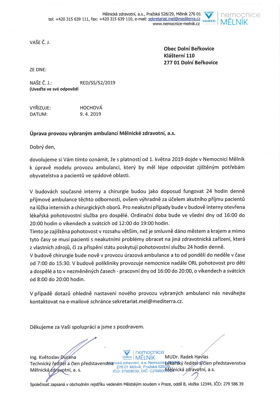 Úvod > Informace > Aktuality > Nemocnice Mělník -úprava provozu ambulancí, pohotovost