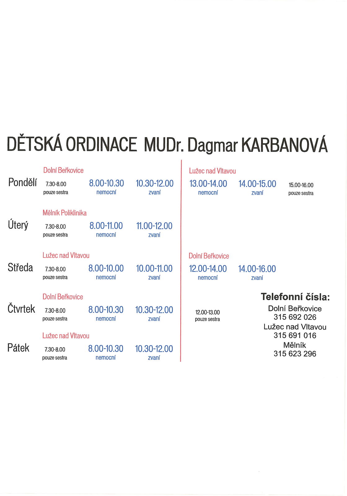 Od 1. května 2019 nebude MUDr. Dagmar Karbanová ordinovat v Cítově a v Horních Počaplech. MUDr. Dagmar Karbanová bude ordinovat v Dolních Beřkovicích a v Lužci nad Vltavou. Zdravotní karty z Cítova a Horních Počapel budou v ordinaci Dolní Beřkovice. V Dolních Beřkovicích přijímáme nové pacienty i novorozence ze všech okolních obcích. Rozšiřujeme ordinační hodiny, nově bude i odpolední ordinace v Dolních Beřkovicích. Dětská ordinace není společná s dospělými pacienty, je to pouze pro dětské pacienty.