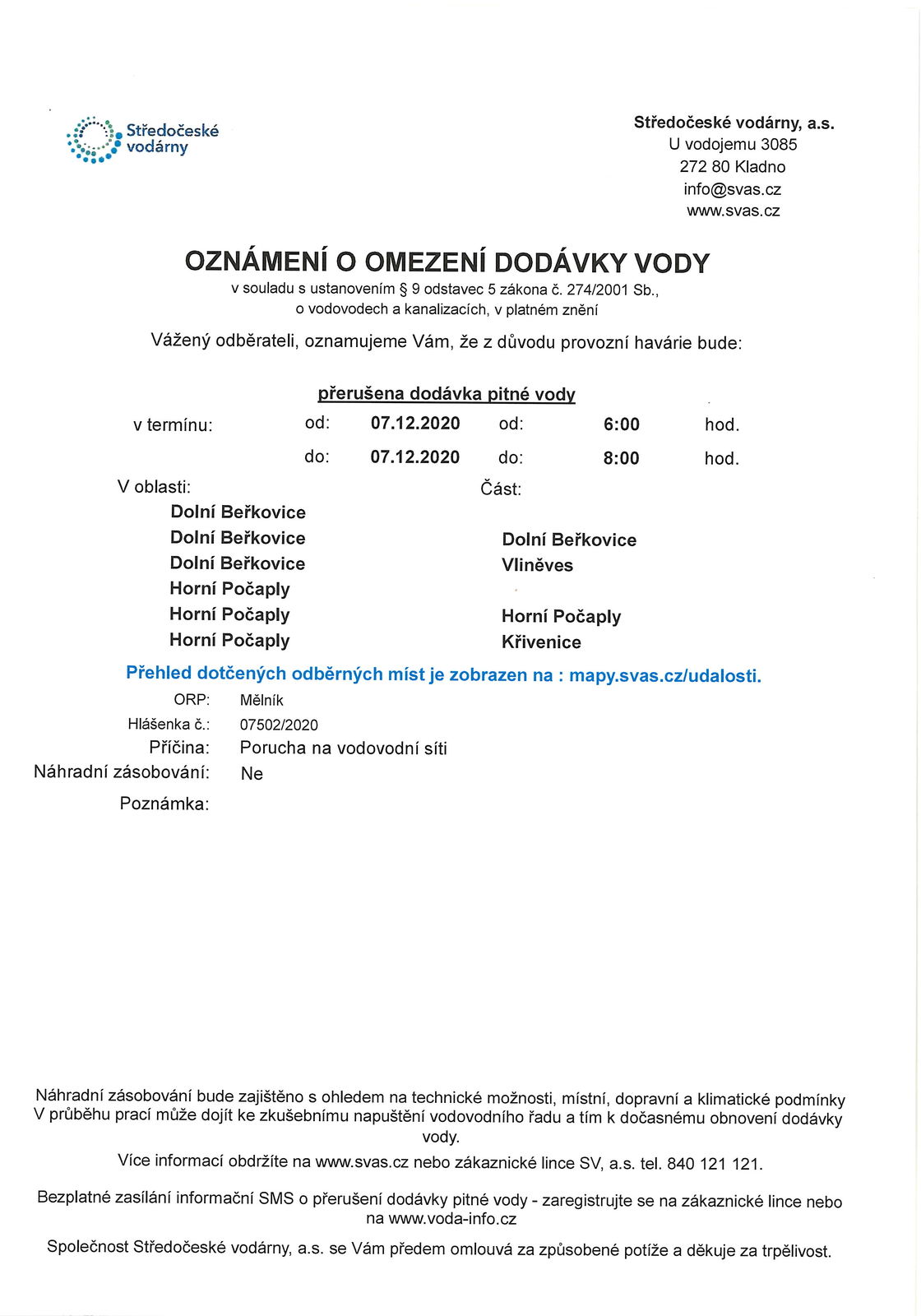 Středočeské vodárny  oznamují  přerušení dodávky vody dne 7.12.2020 v čase přibližně od 6.00 do 8.00 hodin.201201153042_0001.jpg
