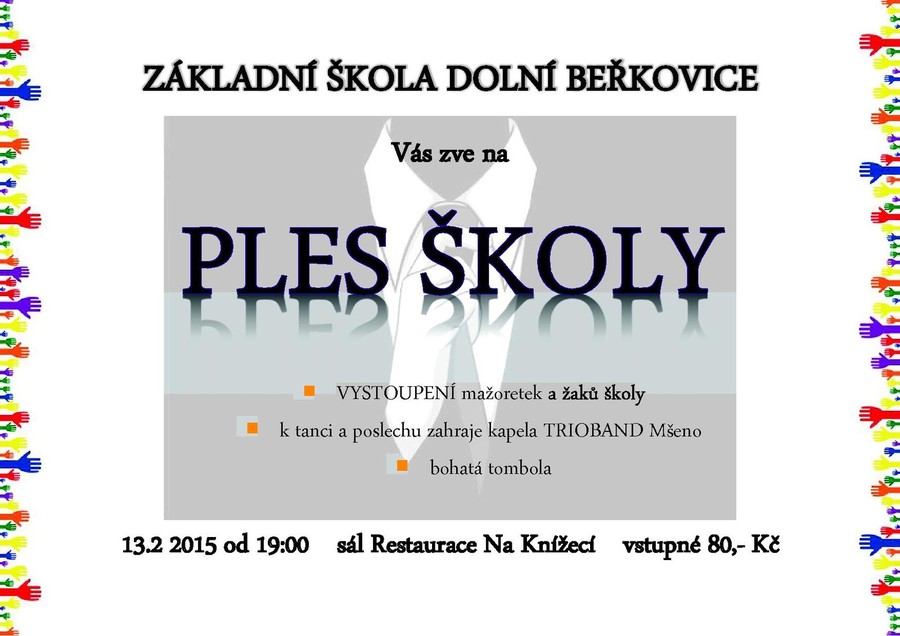 Základní škola Dolní Beřkovice Vás zve na školní ples, který se koná 13. února 2015 od 19. 00 hod. na sále restaurace Na Knížecí. Na plese vystoupí mažoretky a žáci školy. K tanci a poslechu Vám bude hrát skupina Trioband Mšeno. Vstupné je 80 Kč. I tento rok je pro Vás připravena tombola.
