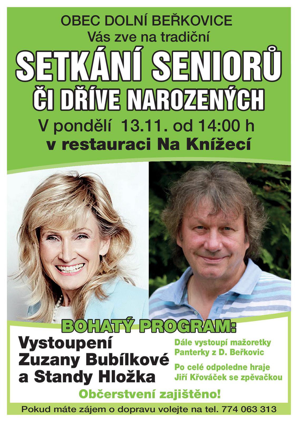 Obec Dolní Beřkovice Vás zve na posezení s důchodci, které se koná v pondělí 13. listopadu od 14:00 hodin na sále restaurace Na Knížecí. V programu vystoupí Zuzana Bubílková, Stanislav Hložek, mažoretky Dolních Beřkovic. Po celé odpoledne bude hrát Jiří Křováček.