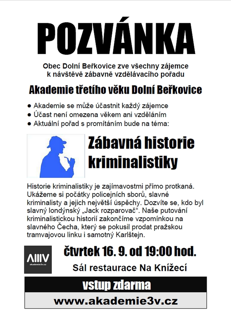 Obec Dolní Beřkovice zve všechny zájemce k návštěvě zábavně vzdělávacího pořadu Akademie třetího věku Dolní Beřkovice - téma Zábavná historie kriminalistiky, který se koná ve čtvrtek 16. 9. 2021 od 19 hodin v sále restaurace Na Knížecí.
