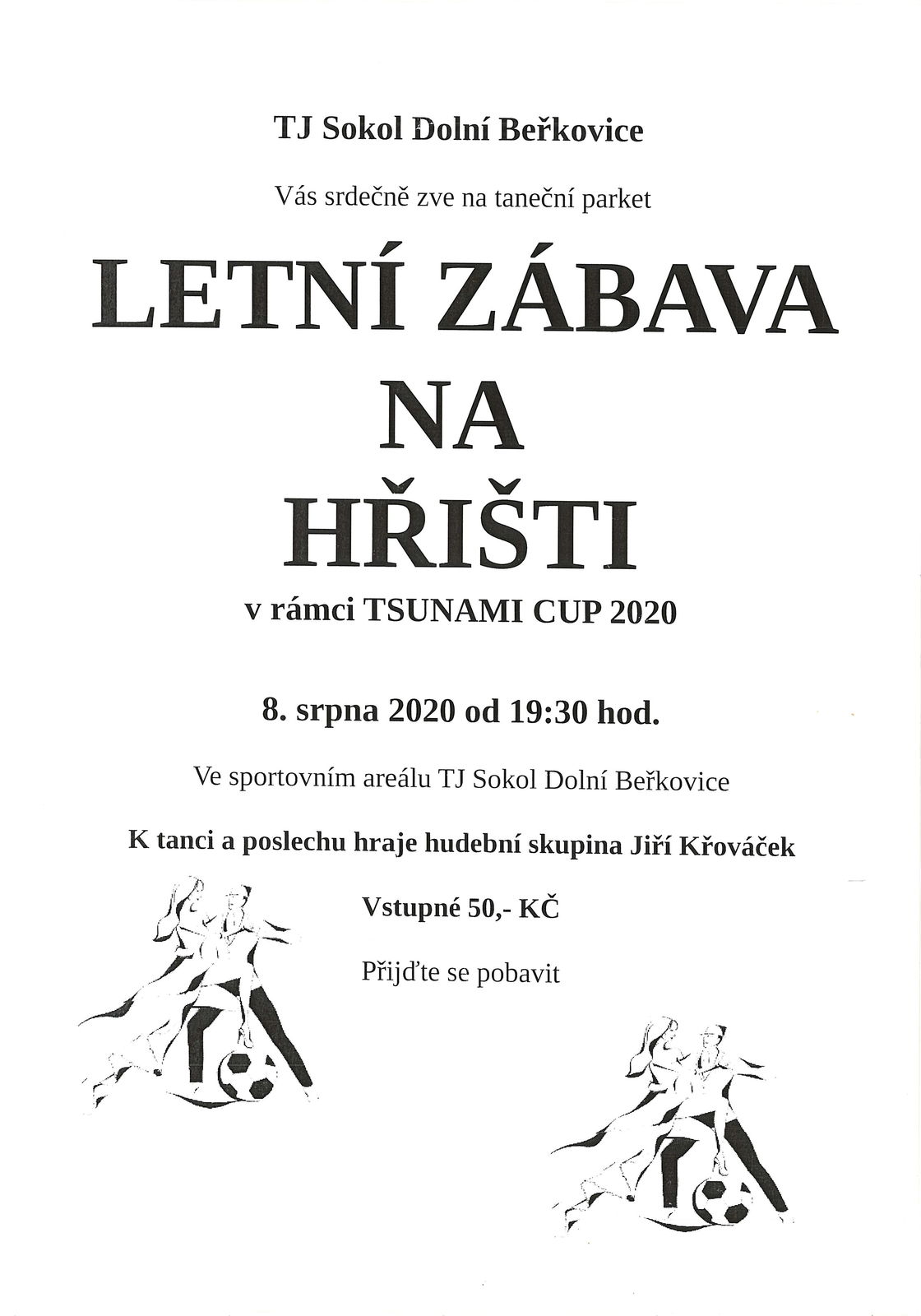TJ SOKOL Dolní Beřkovice zve občany na Letní zábavu na hřišti, která se koná dne 8.8.2020 od 19,30 h na hřiští TJ SOKOL Dolní Beřkovice. K tanci a poslechu bude hrát hudební skupina pana Jiřího Křováčka. Vstupné 50,- Kč. Přijďte se pobavit.