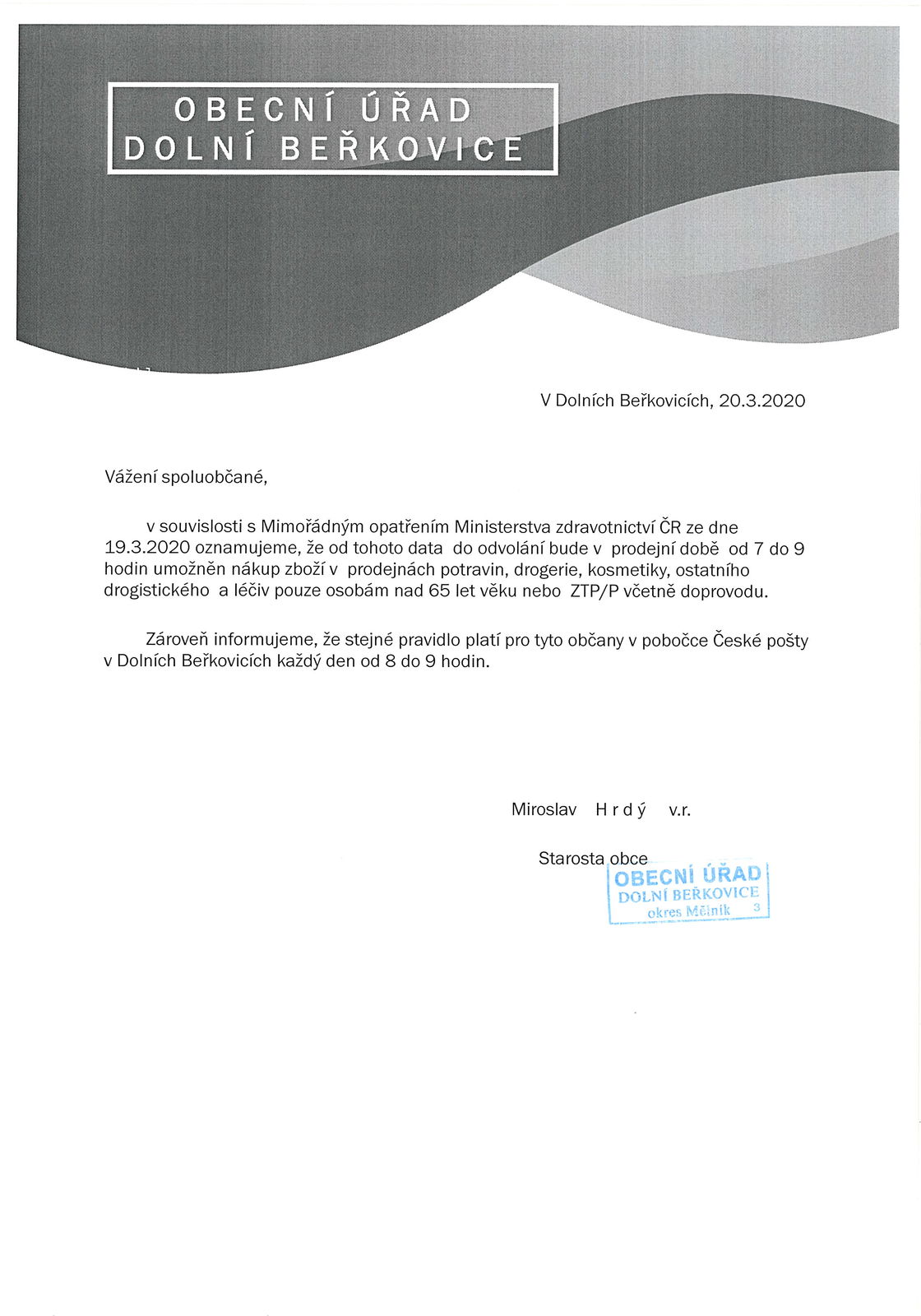Informujeme občany o zavedení možnosti nákupu zboží a čerpání služeb pro osoby nad 65 let věku a osoby ZTP v souvislosti s nepříznivým epidemiologickým vývojem ve výskytu onemocnění COVID-19 v ČR.