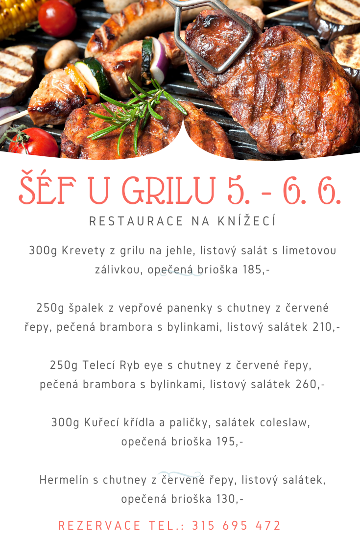 Gril vol III.FB.pngPřijďte se podívat, jak bude fungovat šéf u grilu o víkendu 5. - 6.6. 2021 v Restauraci Na Knížecí. Objednávejte si raději předem na tel. 315 695 472.