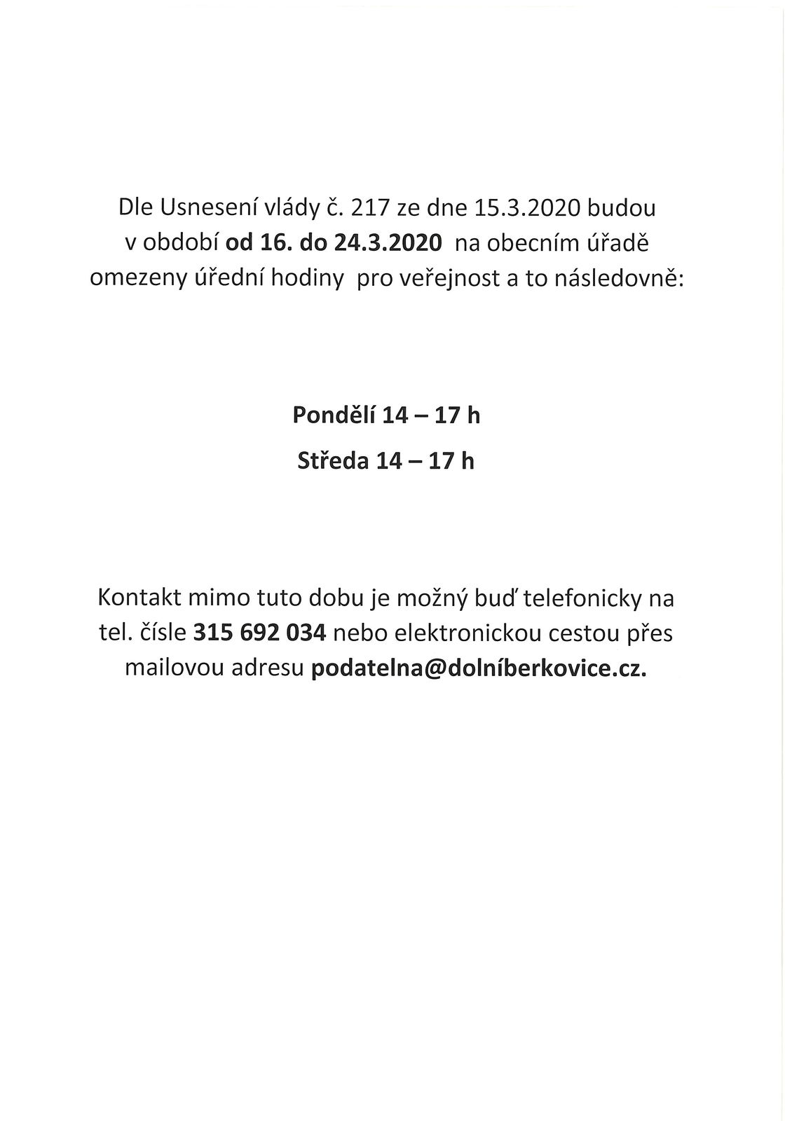 Kontakt mimo tuto dobu je možný buď telefonicky na tel. čísle 315 692 034 nebo elektronickou cestou přes mailovou adresu podatelna@dolniberkovice.cz.