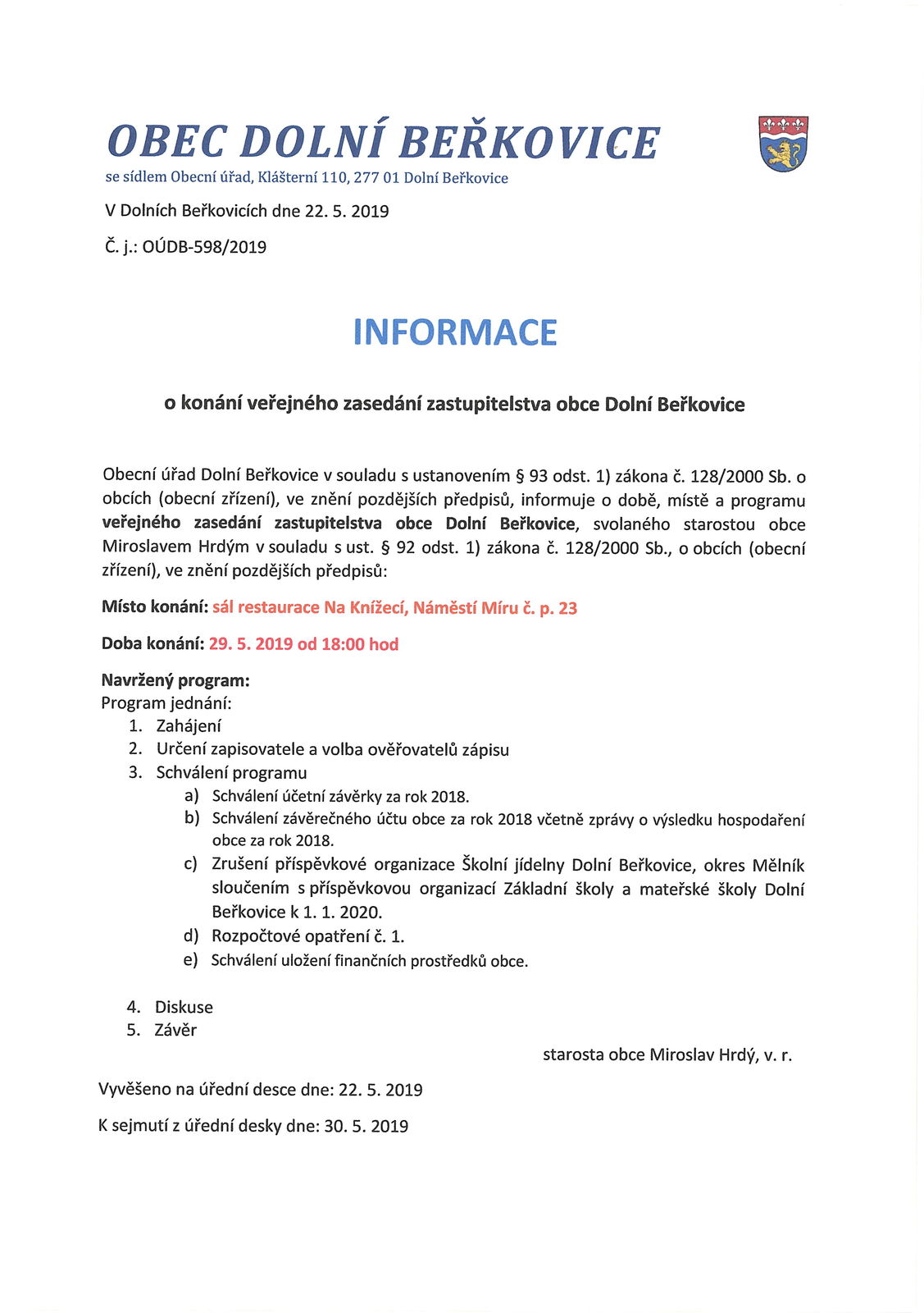 Veřejné zasedání zastupitelstva obce Dolní Beřkovice se bude konat dne 29.5. 2019 od 18:00 hodin. Více informací v příloze.