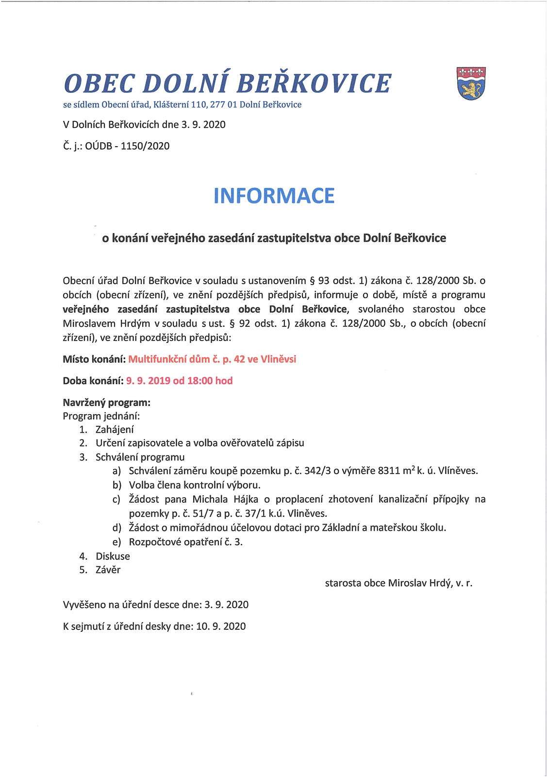 Úvod > Informace > Aktuality > Veřejné zasedání zastupitelstva obce Dolní Beřkovice