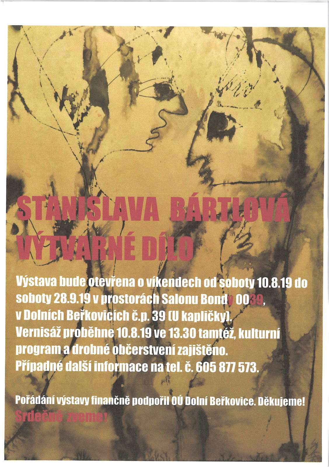 Milan Kinkor Vás srdečně zve na výstavu: Stanislava Bártlová - výtvarné dílo, která bude otevřena o víkendech od soboty 10.8. 2019 do soboty 28.9. 2019 v prostorách Salonu Bondy 0039 v Dolních Beřkovicích č.p. 39. Bližší informace v příloze.