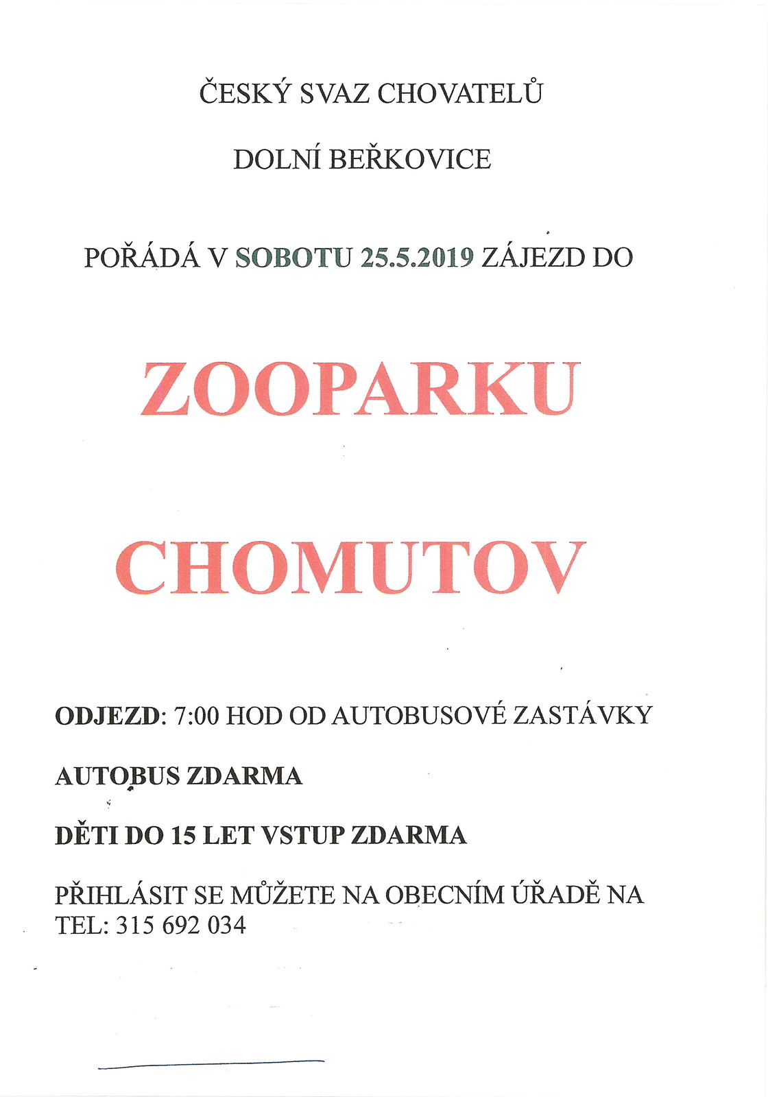 zájezd do Zooparku Chomutov.jpgČeský svaz chovatelů Dolní Beřkovice pořádá dne 25.5. 2019 zájezd do Zooparku Chomutov. Přihlásit se můžete na OÚ, tel.: 315 692 034. Více informací v příloze.