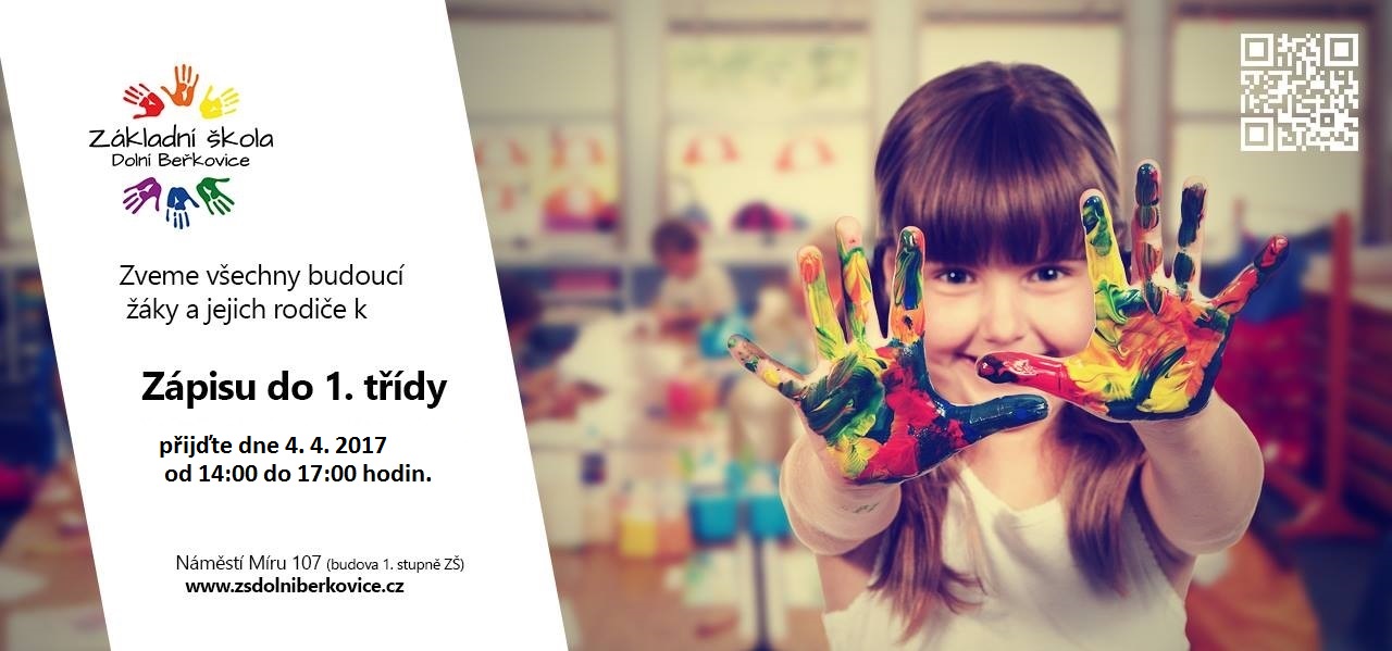 zapis_ZS_2017.jpgZákladní škola Dolní Beřkovice, zve budoucí žáky a rodiče k zápisu do 1. třídy, který se uskuteční 4. dubna 2017 od 14 do 17:00 hod. v budově 1. st. ZŠ.