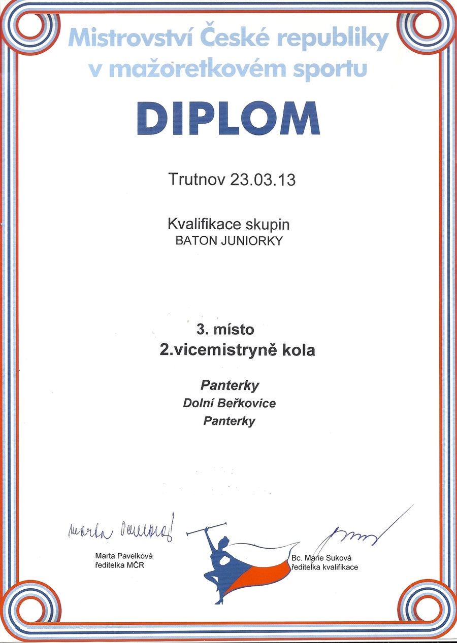 V sobotu 23. 3. proběhlo v Trutnově mistrovství ČR v tomto dnes zcela plnohodnotném odvětví sportu. A jsme rádi, že se s vámi můžeme podělit o úspěchy, kterých dosáhlo družstvo reprezentující naši obec. Naše mažoretky obsadily bronzovou příčku ve skupině a postoupily do semifinálových bojů, které se uskuteční v květnu ve Stochově. Budeme samozřejmě držet palce a doufat v co nejlepší umístění. Za reprezentaci obce děkujeme i Terezce Adámkové, která získala stříbro v sólových choreografiích a také postup do semifinále. Navíc získala i VIP cenu poroty za největší sympatie. Gratulujeme.